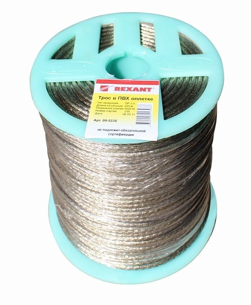 Трос металлополимерный, покрытый пластикатом ПВХ прозрачного цвета устойчивым к агрессивным средам и солнечному излучению; диаметр троса без покрытия 2.8мм, с покрытием 3.5мм; t-раб.-40...+50°C. Бухта 200 м