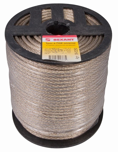 Трос металлополимерный, покрытый пластикатом ПВХ прозрачного цвета устойчивым к агрессивным средам и солнечному излучению; диаметр троса без покрытия 4мм, с покрытием 5мм; t-раб.-40...+50°C. Бухта 100 м