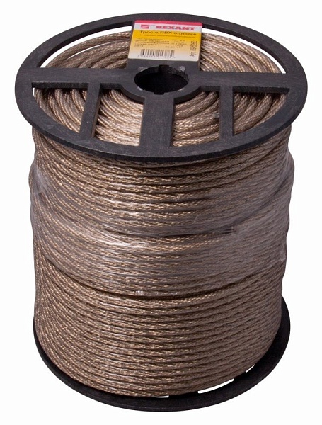 Трос металлополимерный, покрытый пластикатом ПВХ прозрачного цвета устойчивым к агрессивным средам и солнечному излучению; диаметр троса без покрытия 5.15мм, с покрытием 6мм; t-раб.-40...+50°C. Бухта 150 м