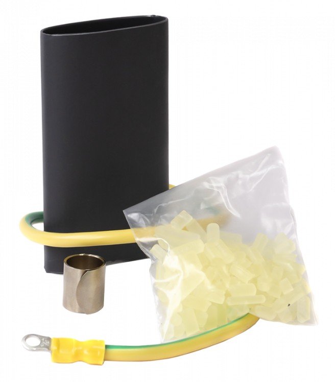 Комплект для заземления металлорукавов в ПВХ изоляции Ø 25…33 мм, в составе: провод заземления с кольцом, контактная пружинная муфта, термоусаживаемая герметизирующая манжета, гранулы термоплавкого клея
