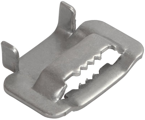 Скрепа для крепления бандажной ленты ЛМ-50; толщина металла 1.5 мм, разрушающая нагрузка 17 кН, напряжение: 1000 В, t-раб. -60...+80 °C, габ.размеры 26х12х43 мм, сталь