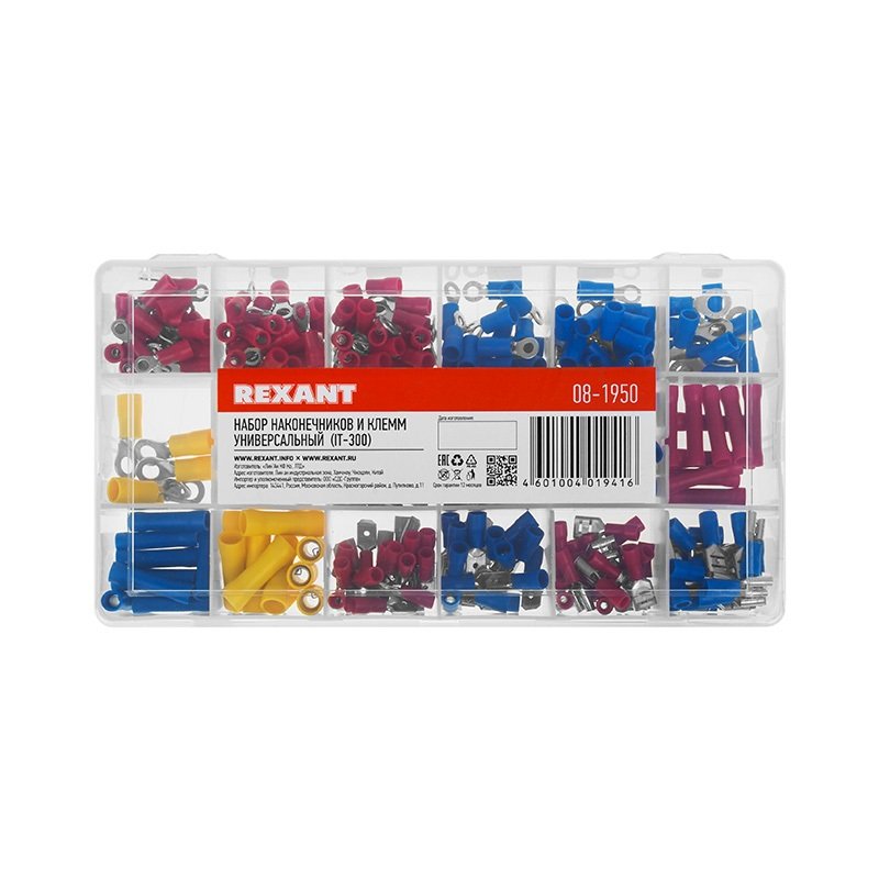 Набор наконечников и клемм универсальный; 12 отсеков; типы наконечников: вилочные, кольцевые и плоские, а также соединительные гильзы; t-раб.-10...+75°С, 210x110x30 мм, 0.34 кг