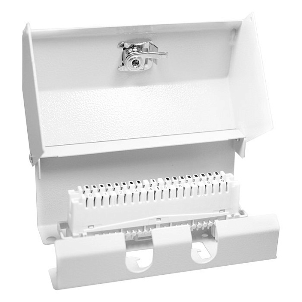 Коробка распределительная металлическая с замком на 1 плинт; IP20, 144х48х61 мм. Цвет серый (RAL 7035). В комплекте один плинт cat.3 на 10 пар с размыкаемыми контактами.