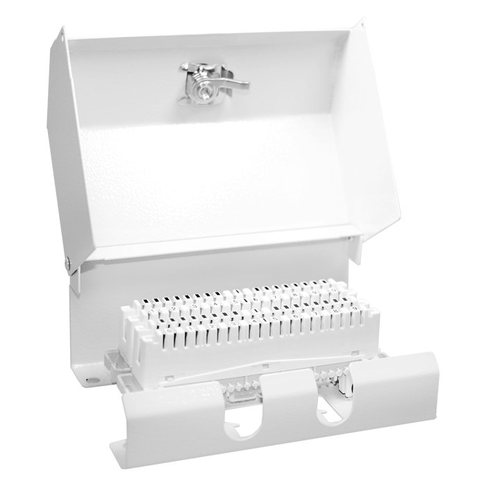 Коробка распределительная металлическая с замком на 2 плинта; IP20, 144х100х61 мм. Цвет серый (RAL 7035). В комплекте два плинта cat.3 на 10 пар с размыкаемыми контактами.