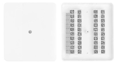 Коробка распределительная телефонная плоская на 2х10 пар проводов, 125х113х27мм. В комплекте перемычка на 10 контактов.