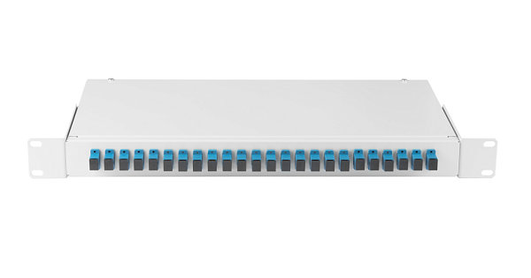 Оптический кросс 19", 1U, укомплектованный на 24 порта SC/UPC(24 одинарных SC/UPC адаптера), SM 9/125 OS2, стальной, серый, в комплекте: адаптеры, монтажные шнуры 1м, сплайс-кассета с крышкой, гильзы