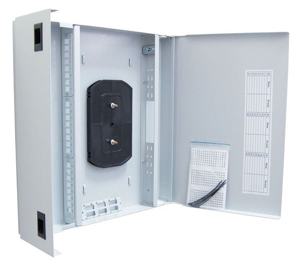 Оптический кросс настенный, с  замком, комплектуется монтажными панелями ST, SC на восемь портов, стяжками, маркерами кабеля и таблицей адресов кроссировки волокон, внутренняя часть оснащена сплайс-кассетой, серый RAL 7035, 416х420х50 мм.