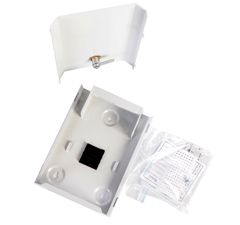 Оптический кросс настенный, с  замком, комплектуется монтажными панелями ST, SC на восемь портов, стяжками, маркерами кабеля и таблицей адресов кроссировки волокон, серый RAL 7035, 270х160х55 мм.