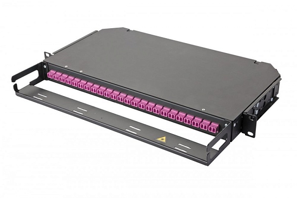 Оптический кросс 19'', 1U , укомплектованный на 24 LC порта(Duplex),полировка (РС) OM4, стальной, чёрный, в комплекте: адаптеры, монтажные шнуры, сплайс-кассета, КЗДС.