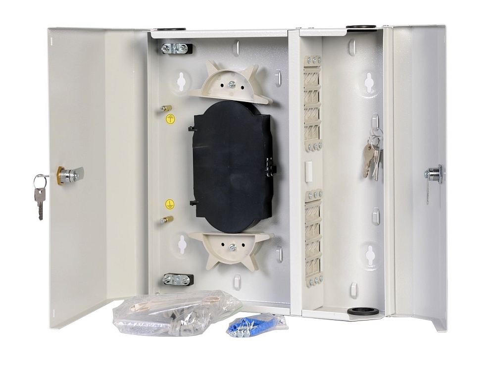 Оптический кросс настенный, две двери, 2 замка, до 24 портов, имеет два отсека - монтажный и кроссировочный, комплектуется сменными вставками для установки адаптеров - SC, ST, FC, LC duplex, стяжками, маркерами кабеля, таблицей адресов кроссировки волокон, гильзами КДЗС и комплектом для крепления к стене, имеет фиксаторы кабеля, лотки для укладки запасов оптического волокна, сплайс-кассету с замком-щеколдой, серый RAL 7035, IP 20, 366х341х78 мм.
