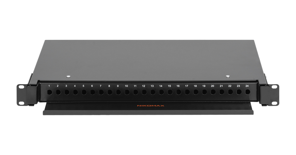 Оптический кросс, 1U, до 24 FC/ST портов, выдвижной, с полкой,  черный, в комплекте: сплайс-кассета и КДЗС.
