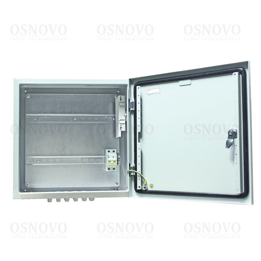 Уличная станция с оптическим кроссом + система обогрева: 2 разъема SC (ложемент 8 КДЗС, пигтейл оптический одномодовый SC 0,9мм длина 1,5м 183x113x22мм); шкаф нержавеющая сталь; IP66, встроенные DIN-рейки: верхняя - 310мм, нижняя -250мм; набор гермовводов; автоматический выключатель 2P 220 В, 10A; -60…+50°С; размеры шкафа 400x400x210 мм. Поддержание температуры внутри шкафа от -0...+55°С (при изменении наружной температуры от -50... +50°С).