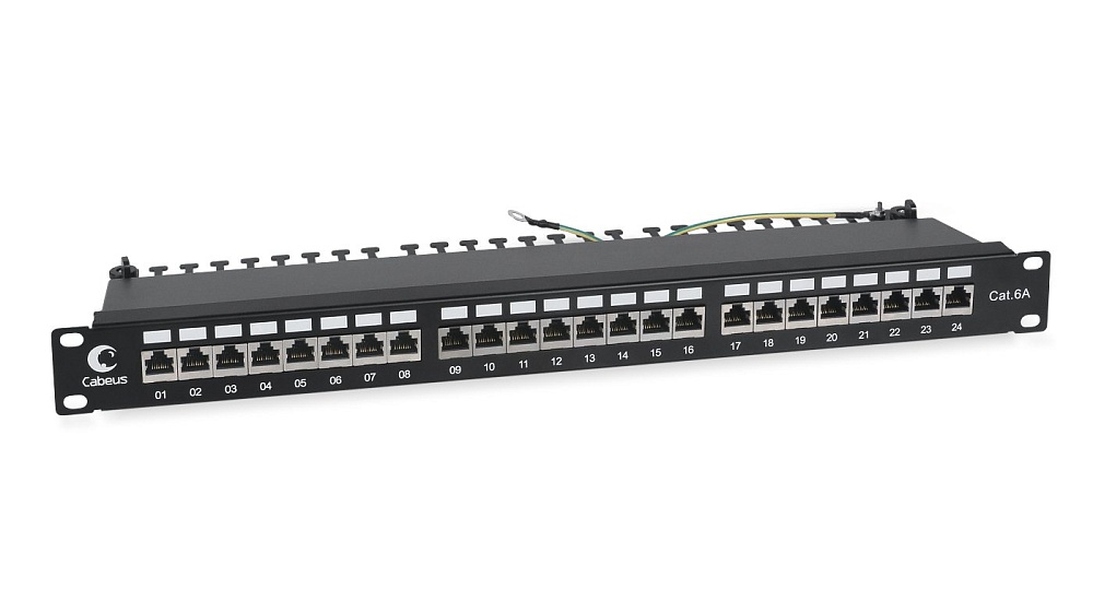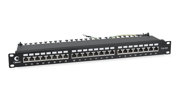 Патч-панель 19" (1U), 24 порта RJ-45, категория 6a, полностью экранированная, с задним кабельным организатором.