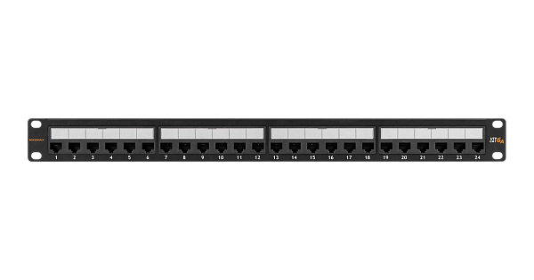 Коммутационная панель 19", 1U, 24 порта, Кат.6a (Класс Ea), 500МГц, RJ45/8P8C, 110/KRONE, T568A/B, неэкранированная, с органайзером, черная.