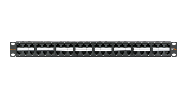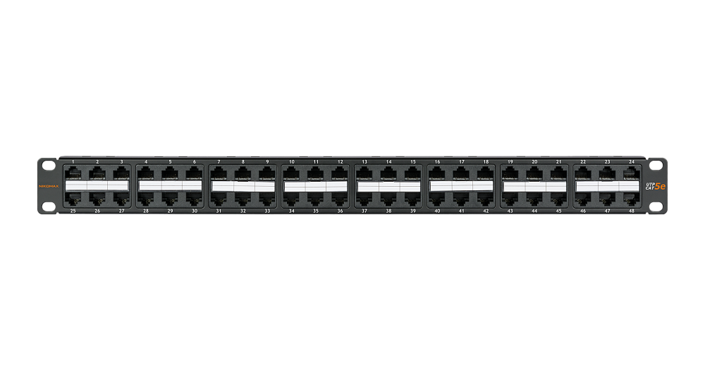 Патч-панель 19", 1U, 48 портов, Кат.5e, RJ45/8P8C, 110/KRONE, T568A/B, неэкранированная, с органайзером, черная.