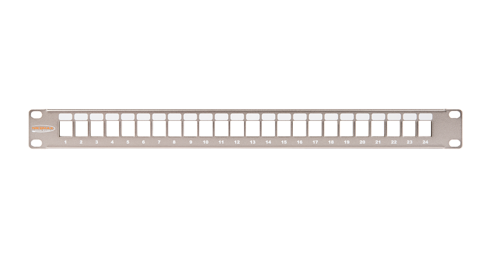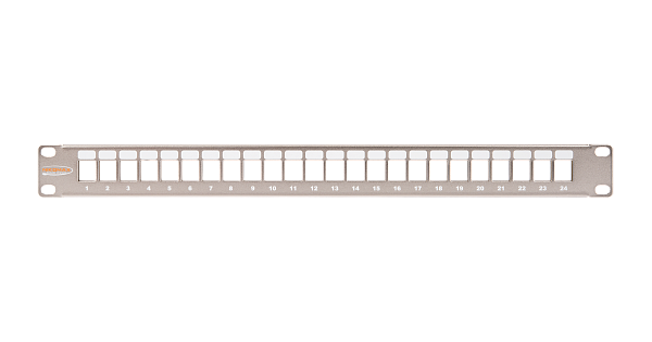 Патч-панель наборная экранированная 19"; 1U; 24 портов Keystone(не шире 17-ти мм), цвет металлик.