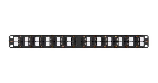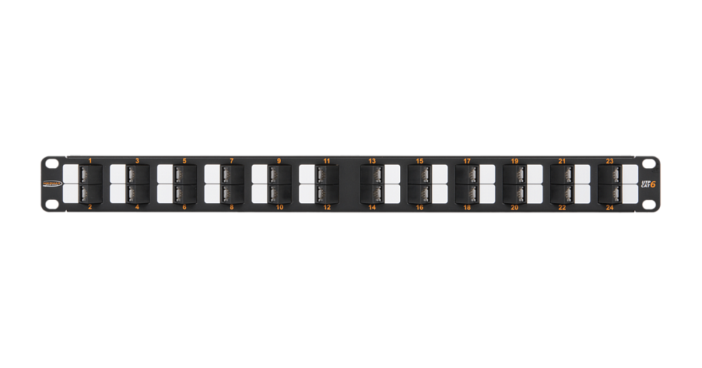 Коммутационная панель NIKOMAX 19", 1U, 24 угловых порта, Кат.6 (Класс E), 250МГц, RJ45/8P8C, 110/KRONE, T568A/B, неэкранированная, с органайзером, черная.