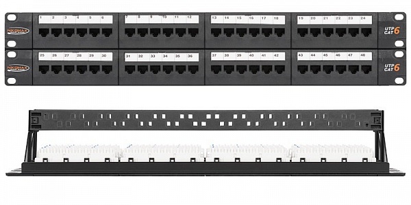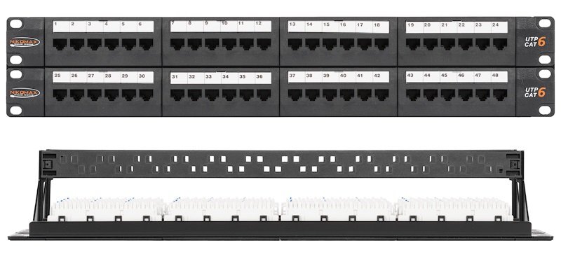 Коммутационная панель NIKOMAX 19", 2U, 48 портов, Кат.6 (Класс Ea), 250МГц, RJ45/8P8C, 110/KRONE, T568A/B, неэкранированная, с органайзерами, черная.