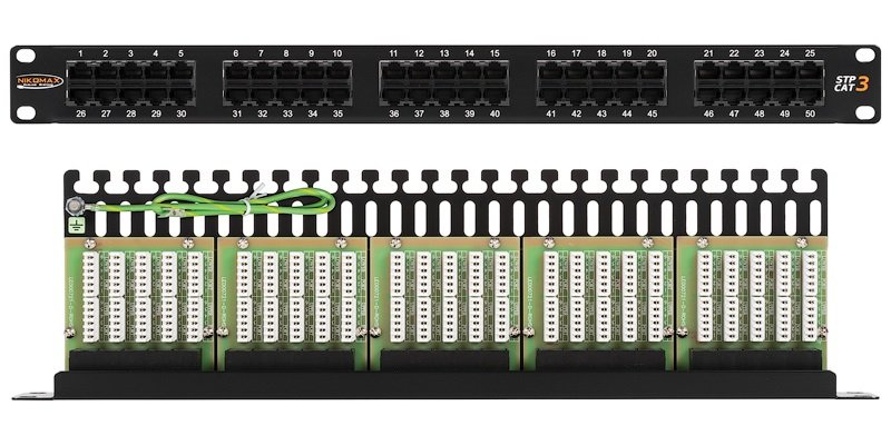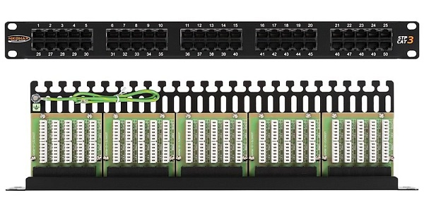 Коммутационная панель NIKOMAX 19", 1U, телефонная, 50 портов, Кат.3 (Класс C), 16МГц, RJ45/8P6C, 110/KRONE, с заземлением, с органайзером, черная.