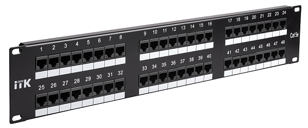 ITK 2U патч-панель кат.5Е UTP, 48 портов (Dual) Тип патч-панели UTP; Категория 5E; Кол-во портов 48; Высота 2U; Тип монтажа на 19” профиль; Диаметр кабеля/патч-корда 22-26AWG; Тип модулей IDC Dual; Маркировка цифровая и цветовая; Материал контактов бронза с позолотой; Цвет панели с портами черный; Сила тока макс 1,5 А; Напряжение 150 В; Контактное сопротивление 20 мОм; Температура эксплуатации: 0°C – +60°C; Сопротивление изоляции 500 МОм; Кабеля в упаковке: 500 м; Особенности конструкции: исполнение с кабельным органайзером и без.; Материал корпуса металл 1,6 мм, ABS-пластик