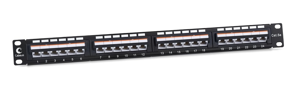 Патч-панель 19" (1U), 24 порта RJ-45, категория 5e, Dual IDC, угол портов 45 градусов.