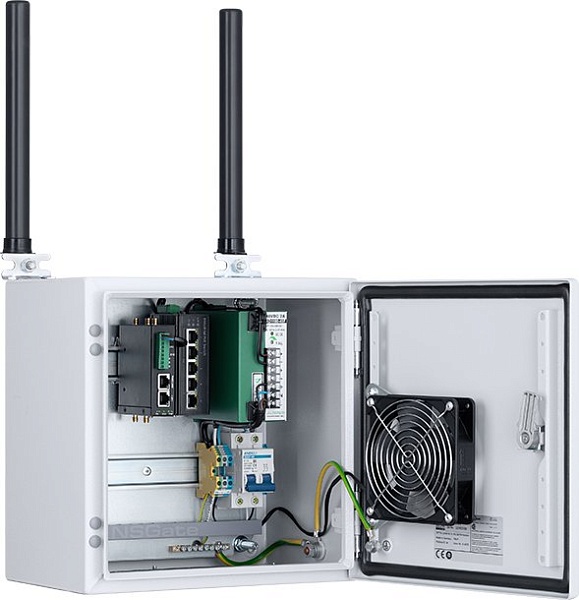 Узел доступа уличного типа, с вентилятором,без нагревателя, 4G LTE коммутатор, промышленный коммутатор сетевой гигабитный неуправляемый с POE; 5 портовый; 4xRJ45 10/100/1000 Base-T с POE 802.3af/at Mode A, 1/2(+)3/6(-) до 30 Вт на порт; 1хRJ45 10/100/1000 Base-T порт; DC 48-58В ; POE бюджет 120 Вт; релейный контакт; Защита от перегрузки и переполюсовки; IP30; -40 …+75 °С; 300x300x210мм.