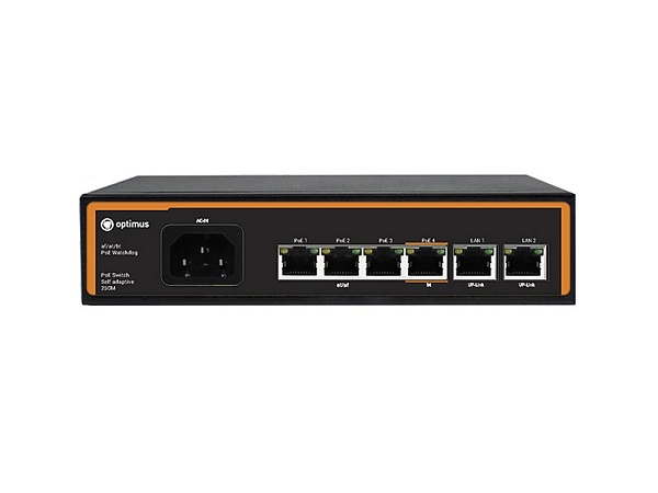 Коммутатор сетевой 6 портовый с РоЕ; 4хRJ45 POE 10/100 Мб поддержкой Auto-MDIX, IEEE 802.3af/at(до 30Вт), 2 порта Uplink 10/100 Мб RJ-45; PoE бюджет до 60 Вт; дальность передачи до 250 метров; грозозащита 2 кВ; внутренний БП AC 90-240В/DC 52В, кабель питания 220В в комплекте; -38°... +60°C; 187x139x43 мм.