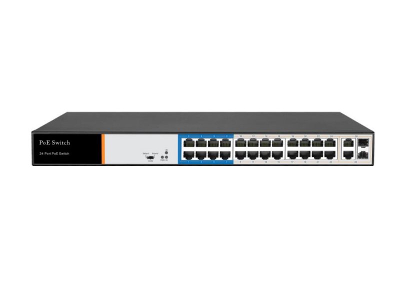 Сетевой Коммутатор 24х портовый с РоЕ; 24х10/100Mbps RJ-45 с поддержкой Auto-MDIX, PoE/PoE+, +2 порта 1000Mbps RJ-45 Uplink или 2 порта Gigabit SFP, на порт 48-53В DC, до 350мА Мах.15.4Вт (IEEE 802.3af), на порт 48-53 В DC, до 520mA Мах. 25Вт (IEEE 802.3at), контакты 1/2 (+), 3/6 (-), до 300 Вт, АС100…240 В, 50/60Гц, 440х295х45 мм, 4000 гр.
