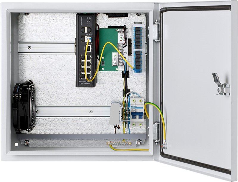 Узел Доступа: WI-PMS312GF-I промышленный коммутатор: uplink 4 SFP/1G, 8 портов TP/1G PoE 802.3at/3bt/15/30/60Вт(Passive 1-2порт) для IP-видеокамер; Reboot PD; шкаф NSB-4040F3 с вентилятором, без нагревателя, с ODF; ИП DC 48В, 360Вт; IP 66; -40…+60°С; 400х400х230 мм.