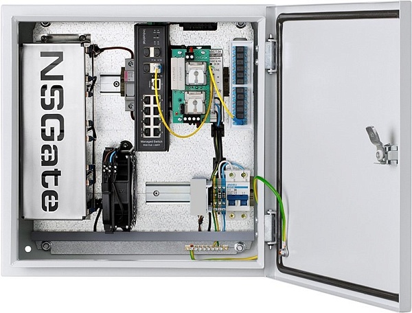 Узел Доступа: WI-PMS312GF-I промышленный коммутатор: uplink 4 SFP/1G, 8 портов TP/1G PoE 802.3at/3bt/15/30/60Вт(Passive 1-2порт) для IP-видеокамер; Reboot PDs; шкаф NSB-4040F3 с вентилятором, без нагревателя, с ODF; СБП NR-DC 48, 360ВА с крепежом для АКБ 7Aч x4; IP 66; -40…+60°С; 400х400х230 мм.