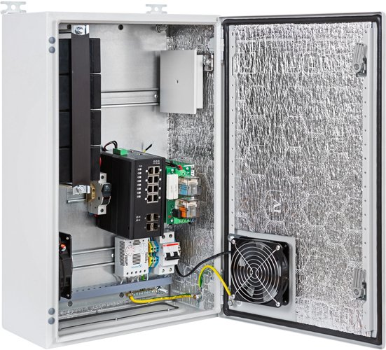 Узел Доступа: NIS-3500-3412PGE промышленный коммутатор: uplink 4 SFP/1G, 8 портов TP/1G PoE 30Вт; Reboot PDs; шкаф NSB-3860H3F1 с нагревателем, с ODF; СБП NR-DC 48В, 360ВА с крепежом для АКБ 7Aч x4; IP 66; -50…+60°С; 380х600х210 мм.