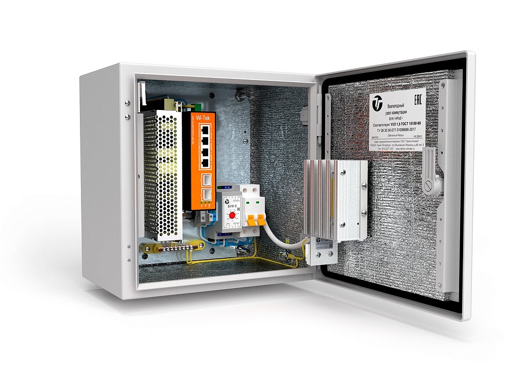 Всепогодный узел коммутации: неуправляемый гигабитный коммутатор, 4xRJ45 порта POE 10/100/1000Мб(af/at); 2хSFP порта 1G; POE бюджет 120Вт; система обогрева с терморегулятором 40Вт; корпус из стали; IP66; -60…+50°С; AC 220В; 170Вт, гермовводы 300х300х210 мм.