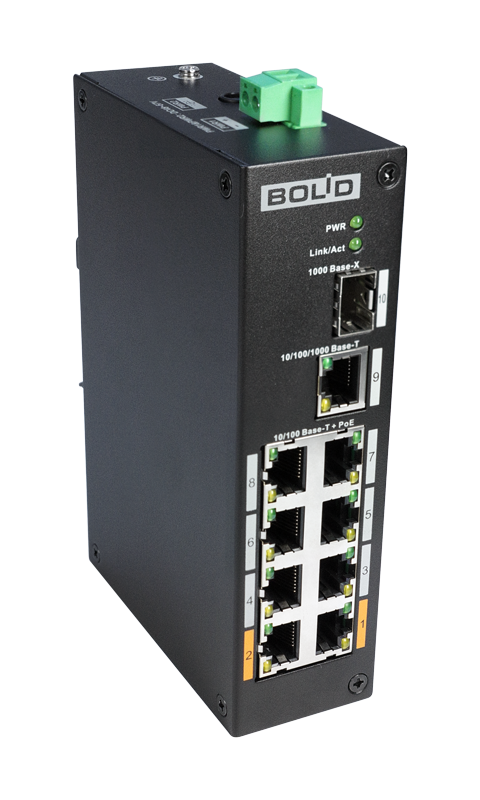 Неуправляемый сетевой коммутатор 1 порт 1000 Base-X, 1 порт 10/100/1000 Base-T Ethernet, 8 портов 10/100 Мб/с (PoE) 96 Вт; U-пит.48...57 В; -30...+65°C, 150×100×42 мм