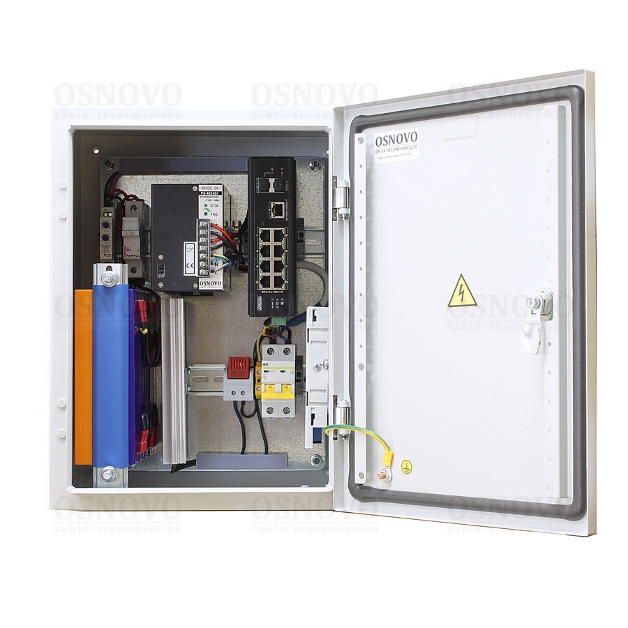Коммутатор неуправляемый 11 портовый c термостабилизацией и резервным питанием; 6хRJ-45 POE 10/100 Base-T, Метод A (IEEE 802.3af/at) до 30Вт, 2хRJ-45 POE 10/100 Base-T, Метод A+В (IEEE 802.3af/at) до 60Вт, бюджет POE 240Вт; 1хRJ-45 10/100/1000 Base-T; 2xSFP 10/100/1000 Base-T; АКБ 48В(2,2Ач)); AC 100-240В; встроенная грозозащита 6кВ; 300x400x210мм; IP66; -40...+50°С. В комплекте оптическая розетка, КДЗС (2шт), пигтейлы SM SC/UPC (2шт). Корпус из металла. Поддержка режима CCTV передачи данных и питания до 250м.