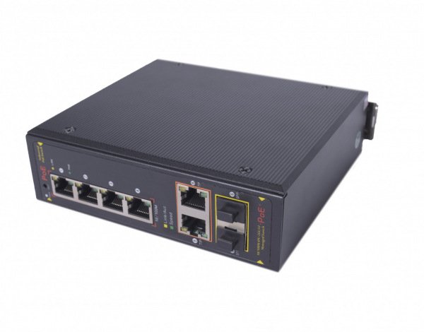 Сетевой коммутатор 6 портовый с РоЕ; Сетевой порт 4xPoE 10/100 Base-TX; RJ45 + 2xUplink 10/100/1000 Base-T(X) RJ45; Управление по сети L2; Оптический порт 2xSFP 10/100/1000 (Совмещенные с 2xRJ45); 70 Вт; -40... +75°C; IP40; Металлический кожух, возможность крепления на DIN рейку в комплекте. 145х133х42 мм.