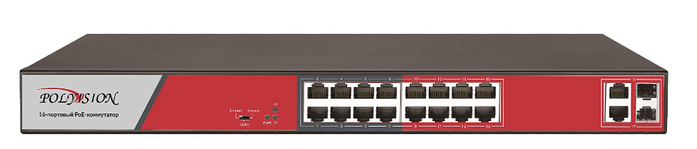 Коммутатор сетевой 18-портовый неуправляемый, 16 портов 10/100 Мбит/с PoE, 2 порта 10/100/1000 Мбит/с, 2 gigabit SFP порта, до 30 Вт на порт, бюджет PoE 150Вт, крепление у 19" стойку, дальность передачи питания до 250м, пропускная способность 7,2 Гбит/с; 3 режима работы (Standart, VLAN, Extend)