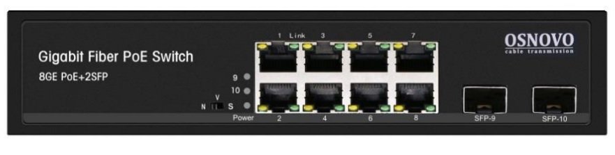 Коммутатор сетевой Gigabit Ethernet неуправляемый 10 портовый; 8 портов POE RJ45 10/100/1000 Мбит/с (IEEE 802.3af/at); 2 порта SFP; Суммарно 150 Вт; 100-240 АС; 0…+40 °С; 210x35x150 мм. Поддержка режима CCTV расстояние передачи данных и питания до 250м.
