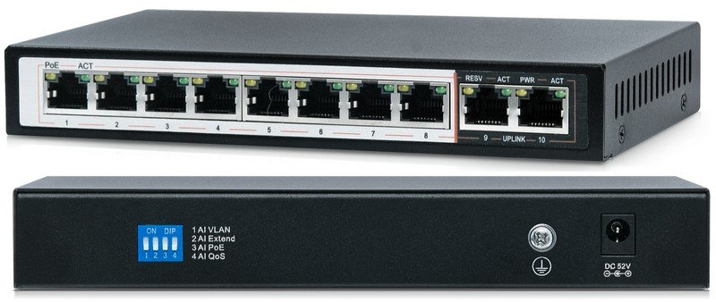 Коммутатор неуправляемый 10 портовый с РоЕ; 8 порта РоЕ; 2 порта Uplink; бюджет РоЕ 96 Вт; AI Extend (передача данных на расстояние до 250 м), AI VLAN, AI QoS (приоритет видео-данных), AI POE (детекция зависания камеры и перезагрузка порта); DC 48...52 В (адаптер в комплекте); 100 Вт; 0...+40℃; 184х94х27мм.