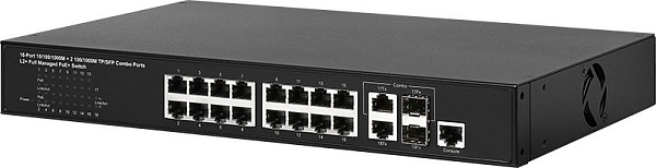 Коммутатор POE управляемый L2+; 16хRJ-45 POE портов 10/100/1000 Мбит/с (IEEE 802.3af/ 802.3at); 4xSFP порта 100/1000; 2 SFP порта 1 G; VLAN, IGMP snooping, QoS; консольный порт RS-232C; USB2.0; AC 100-240 В; PoE бюджет 370 Вт; MTBF > 100000 часов; 0…+40 °С; 440х331х44 мм.
