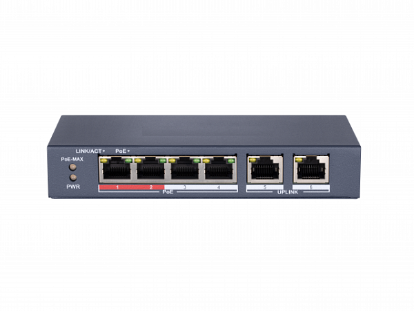 Коммутатор сетевой неуправляемый 6 портовый; 4хRJ45 10/100M PoE(802.3af/at) до 30 Вт; 2хRJ45 10/100M; таблица MAC адресов на 16К записей; пропускная способность 1.6Гб/с; бюджет PoE 35Вт; поддержка режима передачи до 250м; DC 48В; 10 °C...+40°C; 145×68×25 мм.