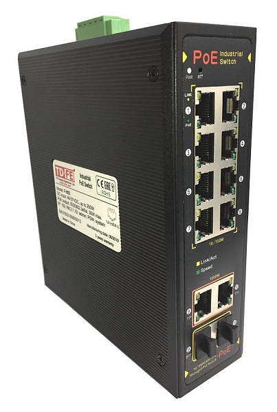 Промышленный управляемый коммутатор Fast Ethernet на 8 POE портов. Порты: 8x (10/100Base-T) POE (30 Вт на порт). + 2 Combo (1000Base-X). Монтаж на DIN-рейку. DC 48В; БП в комплект не входит; -40…+70°C; 167х72х142.5 мм.