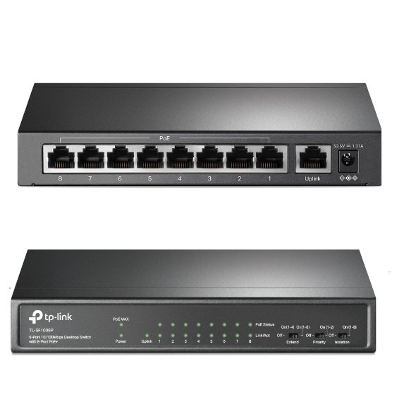 Коммутатор сетевой с РоЕ Fast Ethernet 9 портовый; 8 портов POE 10/100Mbps RJ-45, IEEE 802.3af/at, 1 порт 10/100Mbps RJ-45 Uplink; бюджет PoE до 30 Вт на порт, общий бюджет PoE до 65 Вт на 8 портов; DC 54 В/1.31 А, БП в комплекте; 0...+40 ℃; 171х98х27 мм. Дальность передачи до 250 метров.