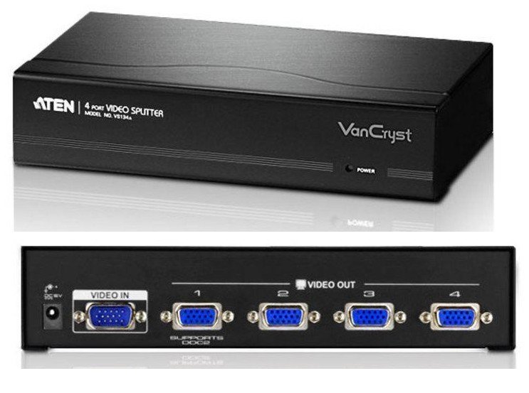 Разветвитель Video Splitter, VGA/SVGA/MultiSync, 1> 4 монитора/port 450MHz, 30 м, без шнуров, Б.П.220> 5В, 2048х1536 60Hz; DC 5 В/0.95 Вт, 0…+50 °C, 200x 75 x 44 мм.