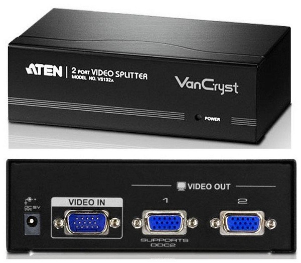 Разветвитель Video Splitter, VGA/SVGA/MultiSync, 1> 2 монитора/port 450MHz, 30 м, F>M, без шнуров, Б.П.220> 5В, (2048*1536 60Hz;5 лет гар+электростраховка;VSA12;TK-V200S), DC 5 В/0.78 Вт 0…+50 °C, 130x 75 x 44 мм.