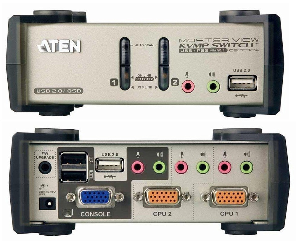 Переключатель, VGA/SVGA+KBD+MOUSE+AUDIO, 1> 2 блока/порта/port PS/2;USB, c KVM-шнурами USB 2х1.2 м, (KVM=монитор+клав.+мышь;консоль упр. - USB;спец.шнур;DDC2B;+ 2 портов. HUB USB 2.0), KVMP Переключатель с OSD меню и поддержкой объемного звучания 2.1, DC 5.3В/3.1 Вт, 0…+50 °C, 140 x 88 x 55 мм.
