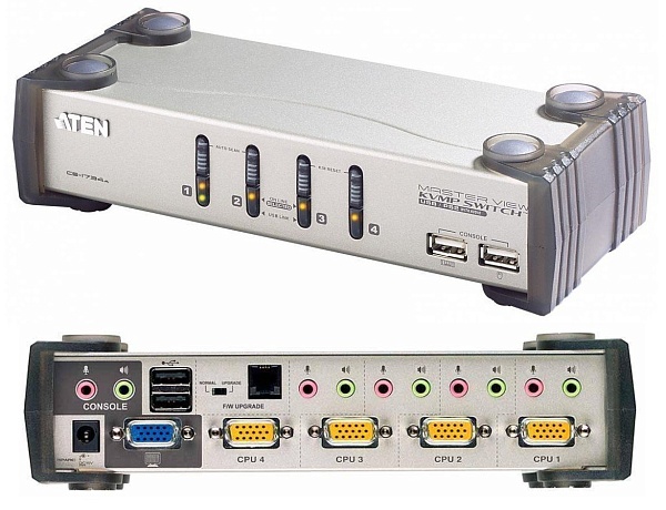 Переключатель, VGA/SVGA+KBD+MOUSE+AUDIO, 1> 4 блока/порта/port PS/2;USB, c KVM-шнурами USB 2х1.2+2х1.8 м, (консоль упр. - USB;спец.шнур;DDC2B;+ 2 портов. HUB USB 1.1), DC 5 В/1.25 Вт, 0…+50 °C, 210 x 88 x 55 мм.