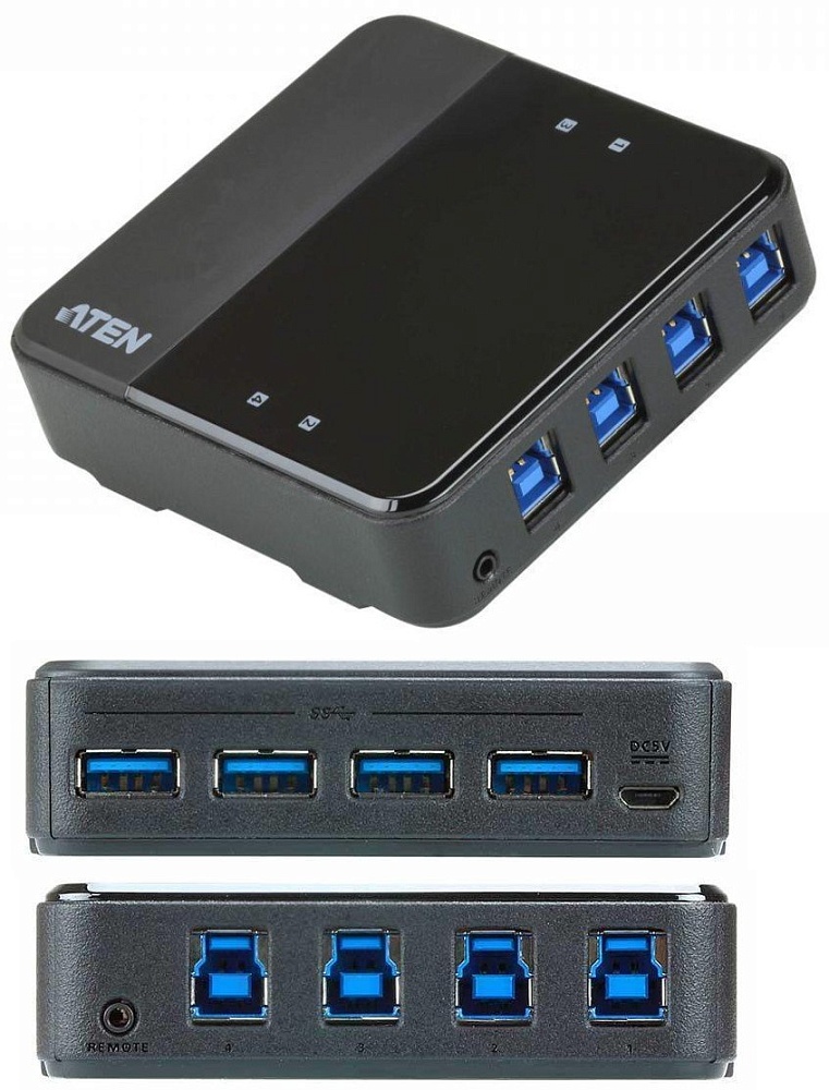 Переключатель, USB, 4> 4 устройства/порта/port+клавиатура+мышь, 4 USB A Female/4 B Female, со шнурами A-B 2х1.2м+2х1.8м/C-B 2х1.8м для подкл. к управ. компьютерам, 0…+40°C, 93х93х27 мм.