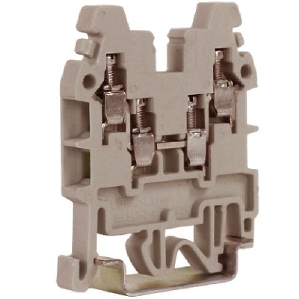 Проходной клеммный зажим, 2 ввода/2 вывода, сечение 2,5 кв.мм, номинальное напряжение 800 В, температура эксплуатации -40…+80°С, размеры 56х43х5 мм, цвет серый