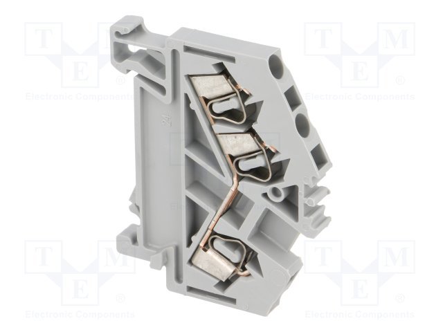 Клемма 3-проводная на DIN-рейку проходная, I-ном.24 А, U-ном.800 В, 3 контакта 0,08..2.5 кв.мм, t-раб.-60…+105°С, 36.5х50.5х9 мм, цвет серый