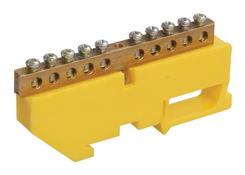 Шина PE "земля" на DIN-изоляторе, сечение шины 8х12 мм, 10 контактов, In 125 А, 88,5х45,4х12 мм, материал латунь, t-раб. -40... +50°C, цвет изолятора желтый